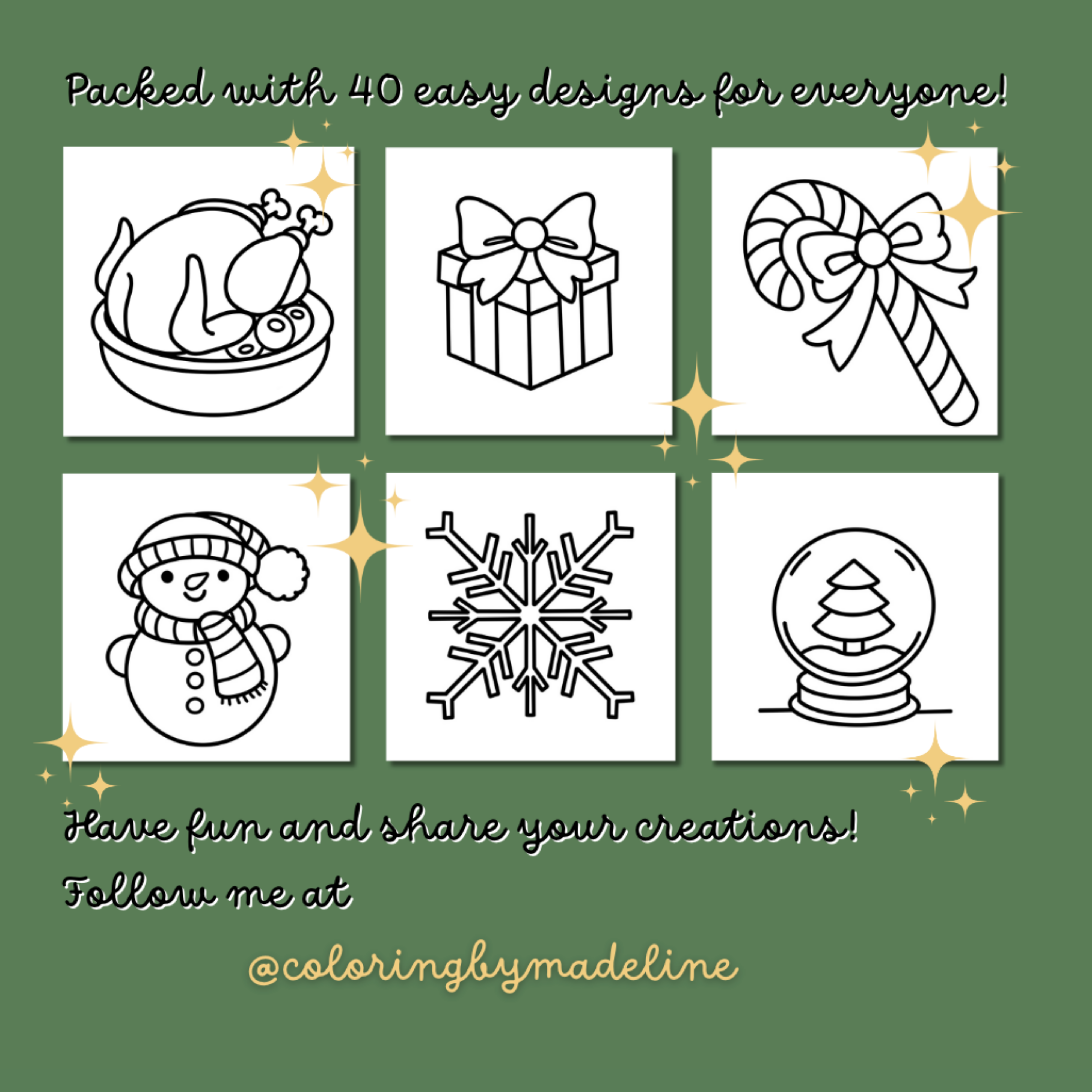 Tyto omalovánky jsou plné oblíbených vánočních a silvestrovských radostí, ideální pro každého, kdo miluje kouzlo Vánoc! Od roztomilých sobů a hravých tučňáků až po vánoční stromeček, třpytivé ozdoby nebo kapra, tyhle omalovánky mají všechno! Ať už sníš o zasněženém zimním království, nebo čekáš na silvestrovský odpočet, Festive Frenzy přináší svátky k životu s jednoduchými obrázky, které si užije každý věk!