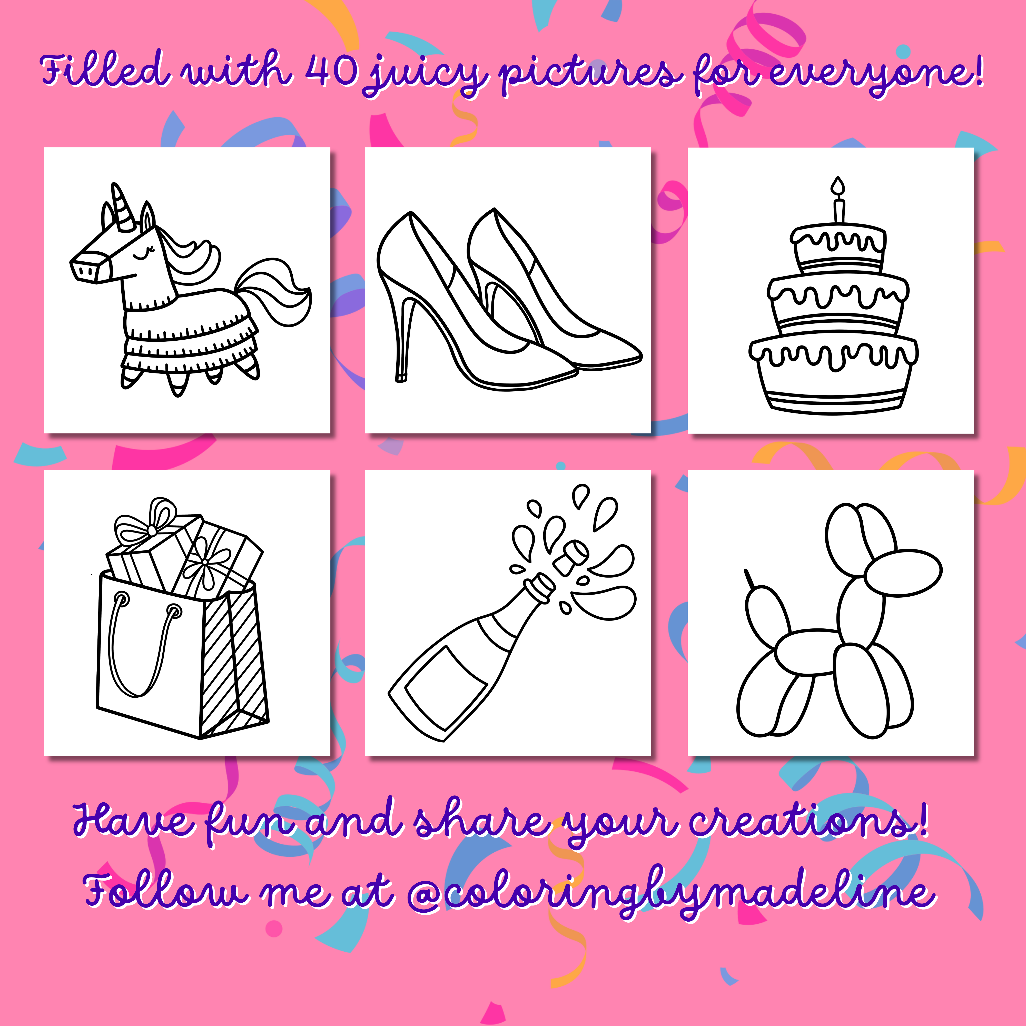 Ponořte se do radosti s těmito veselými omalovánkami plnými oslav a svátečních chvil! Od lahodných dortů, osvěžujících nápojů přes balónky, piñaty, hudbu až po stylová překvapení – každá stránka překypuje párty náladou. Ať už pro děti, nebo dospělé, tyto omalovánky jsou pro všechny, kdo milují tvoření a zábavu. Obsahují speciální stránku pro věnování, kam můžete napsat milé přání – ideální dárek k narozeninám, výročí nebo jen tak pro radost. Chyťte fixky a oslavujte s barvami!